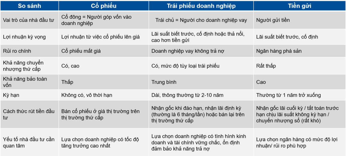 Bảng so sánh giữa các kênh Trái phiếu doanh nghiệp, Cổ phiếu và Tiền gởi tiết kiệm