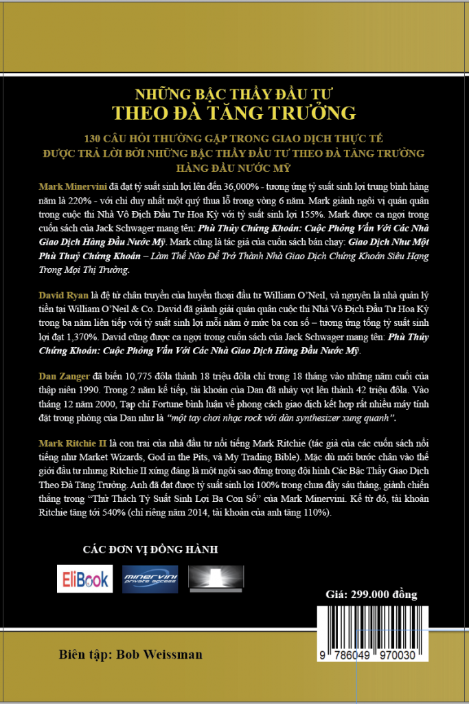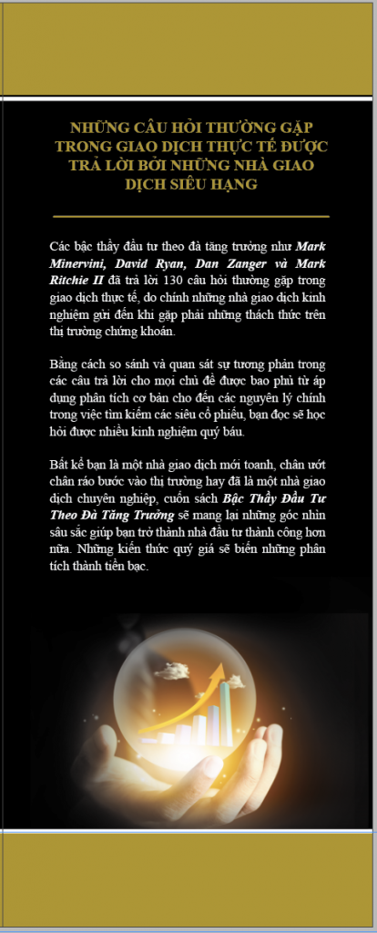 ĐẶT TRƯỚC“Các bậc thầy đầu tư theo đà tăng trưởng bao gồm: Mark Minervini, David Ryan, Dan Zanger và Mark Ritchie II sẽ trả lời 130 câu hỏi thường gặp trong giao dịch thực tế, do chính những nhà giao dịch kinh nghiệm gửi đến khi gặp phải những thách thức trên thị trường chứng khoán”