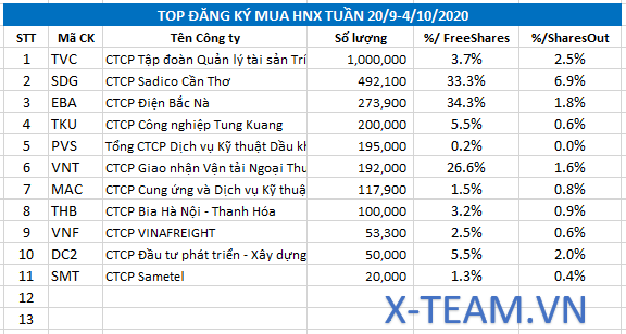 Ở mục đăng ký mua, có 11/360 DN trên HNX có cổ đông nội bộ đăng ký mua.