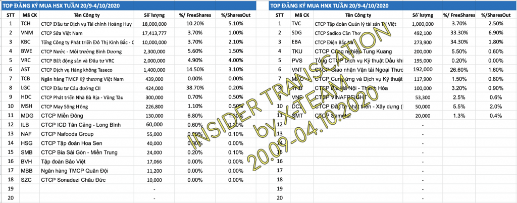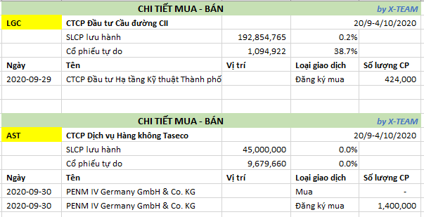 X-Team kính gởi anh/chị dữ liệu giao dịch của cổ đông nội bộ trong tuần từ 20/09 – 04/10/2020 với một số điểm nổi bật.