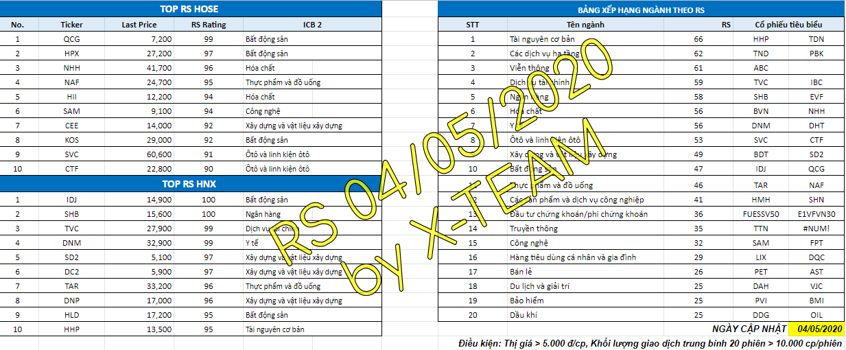 X-Team kính gởi anh/chị dữ liệu sức mạnh giá (RS- Relative Strength) update đến ngày 04/05/2020.