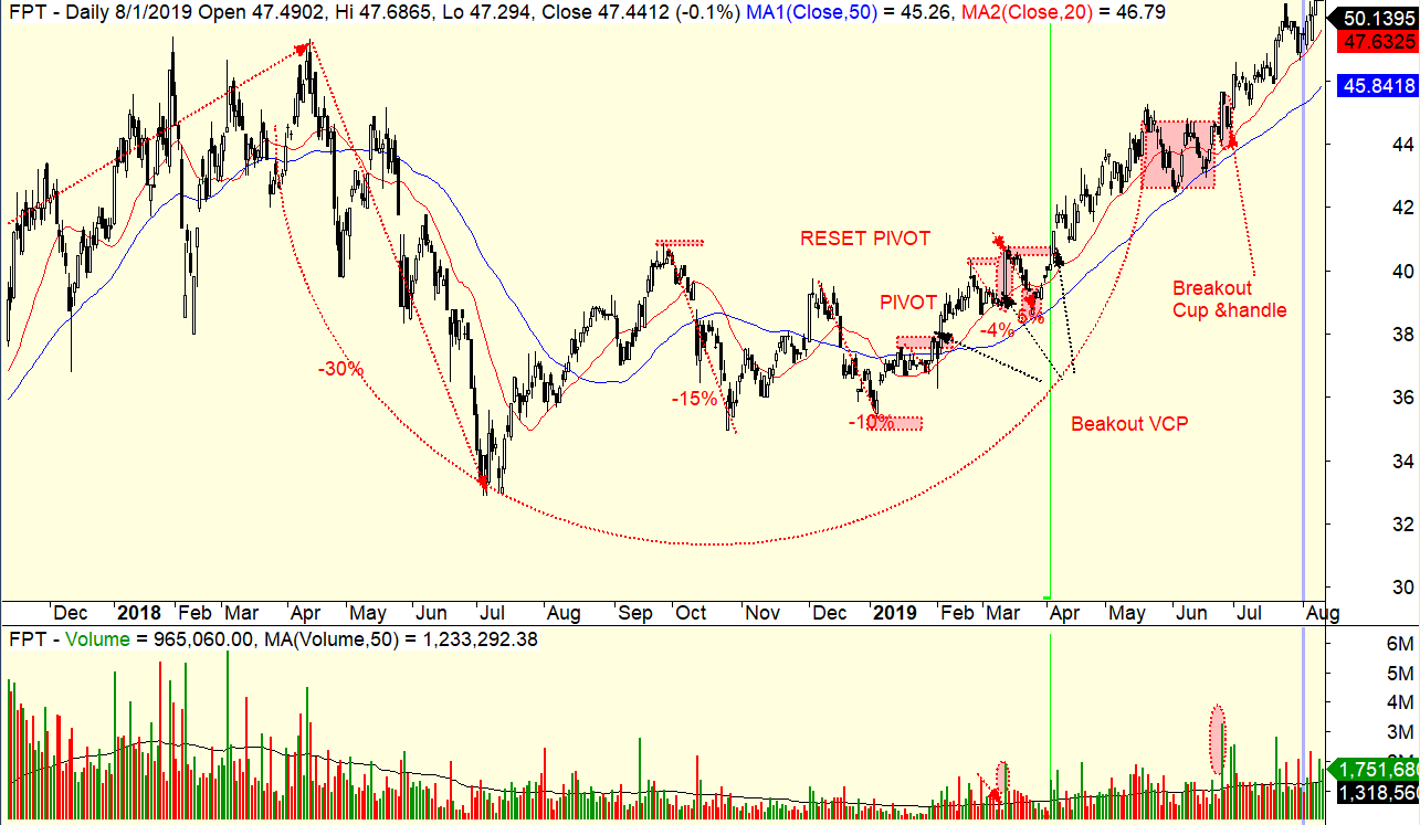 Hình dưới cho thấy FPT hình thành một mâu hình VCP ở phía bên phải chiếc cốc để tìm ra điểm mua sớm trước mẫu hình chiếc cốc-tay cầm. Tuy nhiên, FPT liên tục reset điểm mua của mẫu hình VCP. Các điểm mua bao gồm 11/2; 12/3 và 2/4/2019. Trong điểm mua ngày 2/4/2019 là điểm mua mạnh và thành công.
