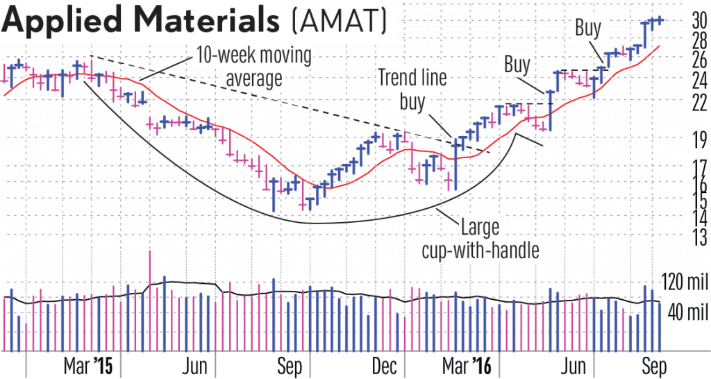 Bạn có thể vẽ một đường xu hướng (Trendline) nối các đỉnh kháng cự ở phía bên trái chiếc cốc. Lúc này, việc giá phá vỡ đường xu hướng kháng cự này với khối lượng lớn mang tới tín hiệu mua. Ngoài ra, bạn có thể mua bổ sung tại các lần vượt đỉnh sau các lần điều chỉnh ở phía bên phải chiếc cốc bởi mô hình PK Technique.