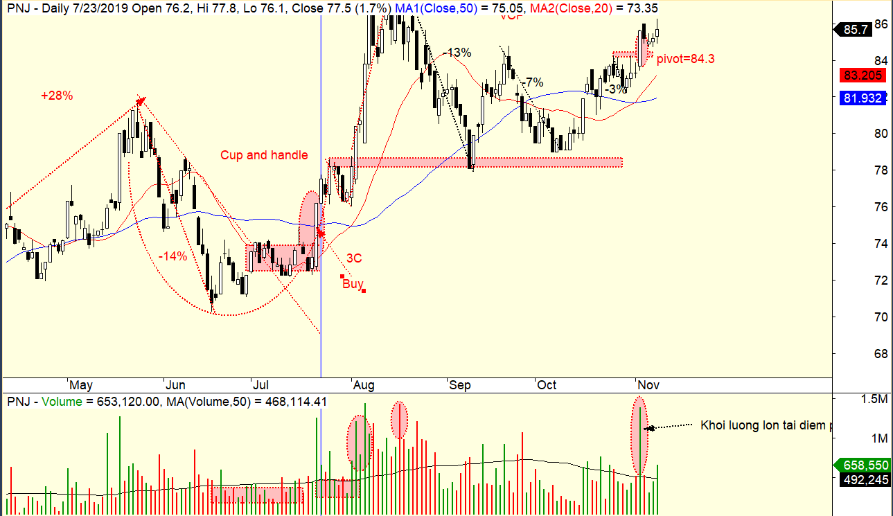 PNJ có mẫu hình 3C trước khi có Chiếc Cốc-Tay Cầm. Chúng ta nối đường kháng cự ở bên trái chiếc cốc như hướng dẫn ở trên. Tuy nhiên, PNJ không có điểm breakout thoát khỏi đường xu hướng kháng cự này. Ngược lại, PNJ tích lũy trong tháng 3 để tạo thành một “cheat” trong mẫu hình 3C. Vào ngày 22/7/2019, PNJ có điểm mua breakout từ mẫu hình 3C.