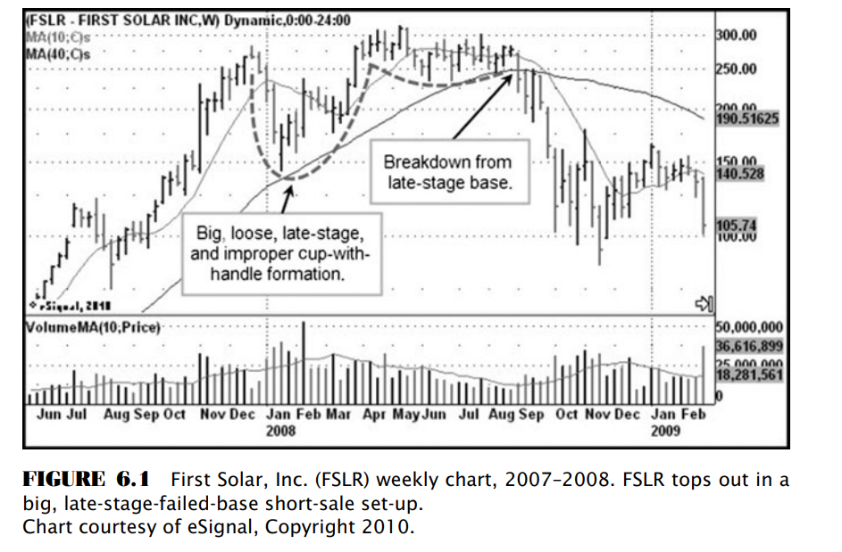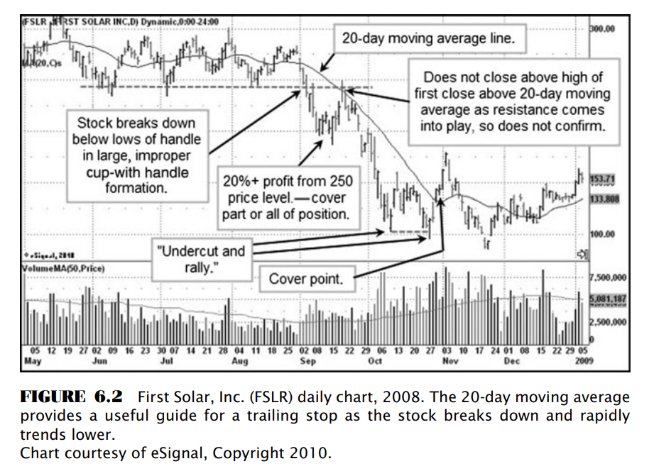 Đôi khi, đường trung bình di động 20 ngày có thể được sử dụng làm công cụ trailing stop (lệnh dừng lỗ động) cho bất cứ vị thế bán khống nào đang có mức lãi khá lớn. Một khi cổ phiếu giảm mạnh từ một tín hiệu bán khống và mẫu hình tạo đỉnh chuẩn, và đã giảm điểm trong vài ngày đến vài tuần, đường trung bình di động 20 ngày thường được sử dụng làm công cụ tham chiếu cho việc xác định sự đảo chiều sang xu hướng tăng, vì thế làm công cụ trailing stop hiệu quả. Trong Hình 6.1, chúng tôi nhìn thấy First Solar, Inc (FSLR) giảm mạnh từ mẫu hình chiếc cốc tay cầm ở nền giá cuối, bị lỗi, lớn, rộng và lỏng. Lưu ý những tay cầm rộng và lỏng này kéo dài với giá đóng cửa nhiều tuần nằm gần sát nhau. Sau đây là mẫu hình mà FSLR đã đạt đỉnh vào cuối năm 2008.
