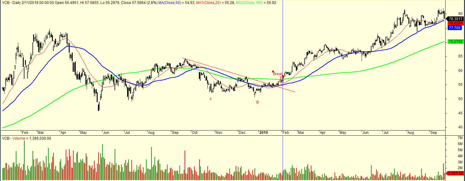 VCB có điểm breakout nền giá 3 (mẫu hình chiếc cốc tay cầm) vào ngày 17/1/2020. Tuy nhiên, sau đó lại điều chỉnh đi xuống khiến điểm phá vỡ bị thất bại. Giá chạm MA50 ngày và bật lên vì đây là đường phòng thủ của big boy. Việc giá hồi phục từ MA50 ngày nhưng không vượt được MA20 ngày là dấu hiệu cảnh báo.