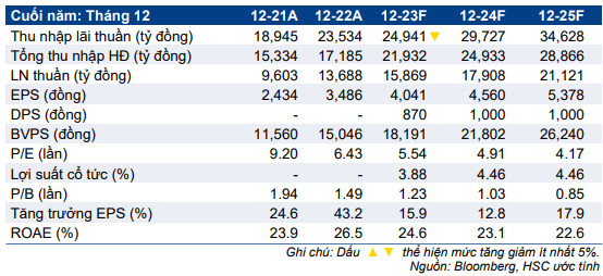 Sau khi phân tích (1) KQKD 9 tháng đầu năm 2023, (2) diễn biến ở mặt bằng lãi suất, và (3) trao đổi của ban lãnh đạo tại cuộc họp về KQKD Q3/2023 diễn ra gần đây, HSC đã điều chỉnh một chút mô hình nhưng nói chung giữ nguyên dự báo lợi nhuận thuần cho năm 2023-2025.