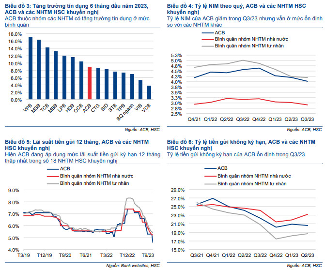 HSC kỳ vọng nhu cầu tín dụng sẽ tiếp tục ấm lên trong Q4/2023 và năm 2024 nhờ mặt bằng lãi suất cho vay giảm cộng với triển vọng kinh tế của Việt Nam tích cực hơn. Với lợi thế về chi phí huy động và tệp khách hàng mạnh, chúng tôi tin rằng tăng trưởng tín dụng tại ACB sẽ tích cực trong những quý tới.
