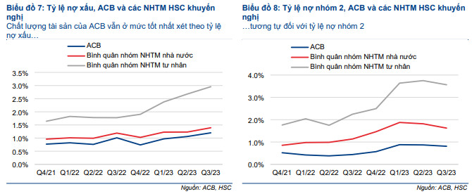 HSC thấy rằng chất lượng tăng trưởng lợi nhuận của ACB trong năm nay chưa thực sự tốt vì tăng trưởng xuất phát từ những mảng khó dự đoán (chẳng hạn như lãi mua bán trái phiếu/lãi thuần HĐ kinh doanh ngoại hối) thay vì các HĐKD cốt lõi như hoạt động cho vay & hoạt động dịch vụ. Tuy nhiên, trong bối cảnh vĩ mô khó khăn năm nay và nền cao trong năm 2022, chúng tôi vẫn đánh giá KQKD từ đầu năm của ACB là đáng khích lệ và cho thấy sự ổn định trong HĐKD của Ngân hàng.