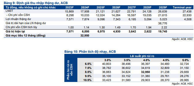 HSC duy trì khuyến nghị Mua vào đối với ACB và nâng 3,8% giá mục tiêu lên 32.900đ (tiềm năng tăng giá 46,9%) sau khi chuyển thời điểm định giá sang cuối năm 2024. Hiện ACB có P/B trượt dự phóng 1 năm là 1,05 lần; thấp hơn 0,9 độ lệch chuẩn so với bình quân từ đầu năm 2019 và cao hơn 13% so với bình quân nhóm NHTM tư nhân.