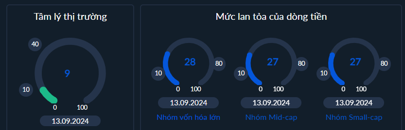 Mức độ lan tỏ của dòng tiền: Dòng tiền có dấu hiệu yếu đi và có sự đồng thuận của nhóm vốn hóa lớn. Với trạng thái hiện tại xu thế vận động ngắn hạn của thị trường đang ở mức kém, các cơ hội mua mới ở mức giá chiết khấu sẽ dễ xuất hiện hơn.
