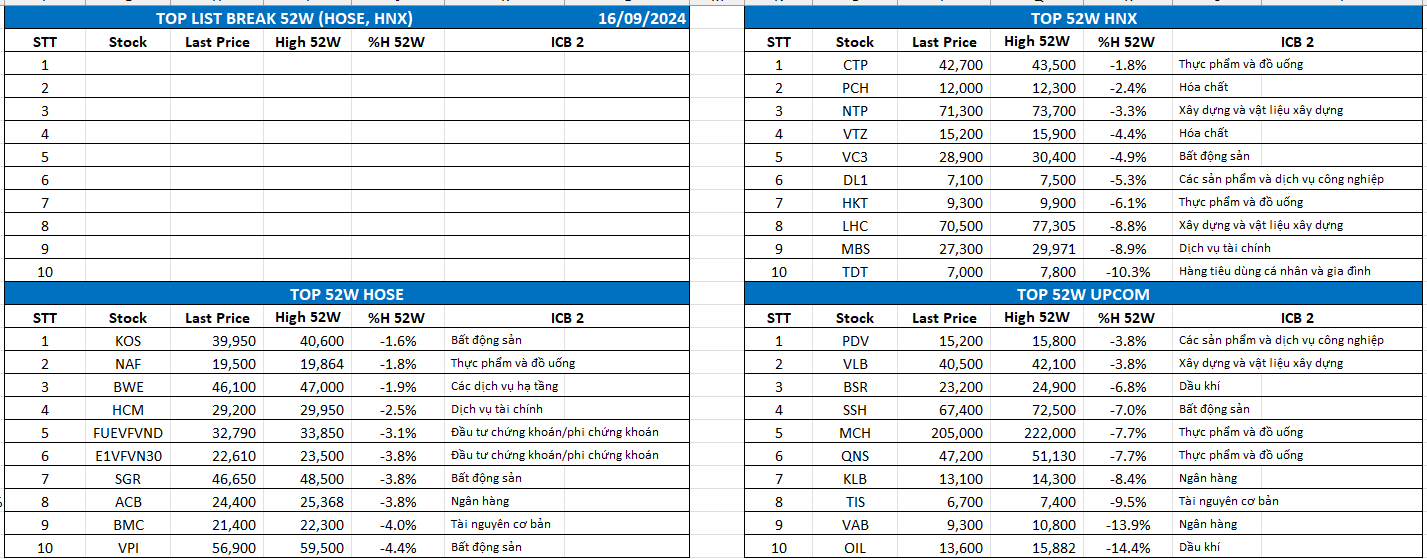 Tính đến hiện tại số lượng cổ phiếu tiệm cận đỉnh 52W đang ghi nhận chững lại đà tăng trưởng, điều này phần nào thể hiện sự giằng co giữ phe mua và bán đang hiện hữu ở VNI. Phiên nay, ghi nhận 64 cổ phiếu tiệm cận 52W (HSX: 47 | HNX: 9 | UPCOM: 8), và dòng tiền đang tập trung chủ yếu tại nhóm: Các sản phẩm công nghiệp, hóa chất và bất động sản