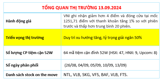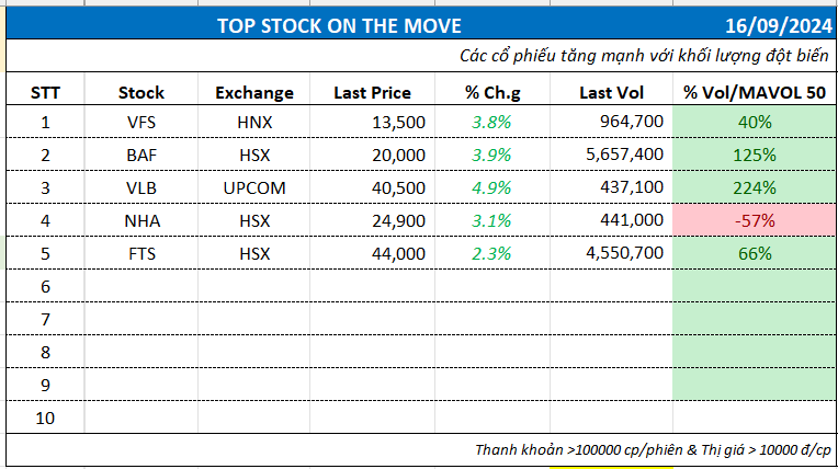Top stock on the move: Cùng với thanh khoản yếu ớt trên thị trường, theo danh sách top 10 cổ phiếu trong bảng Stock on the move phiên 13.09.24, chỉ ghi nhận sự suất hiện của 4 cổ phiếu tăng mạnh kèm khối lượng đột biến: VFS, BAF, VLB, FTS.