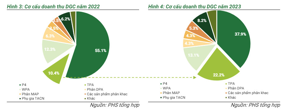– Cơ cấu doanh thu 2023: Sản phẩm Phốt pho vàng (P4): đang là mảng kinh doanh chính của DGC khi đóng góp đến 55%/38% tổng doanh thu trong năm 22A/23A. Sản phẩm Axit Phosphoric (TPA & WPA): Các sản phẩm của công ty bao gồm axit phosphoric nhiệt phân (TPA), axit phosphoric thích ly (WPA). Sản phẩm phân bón.