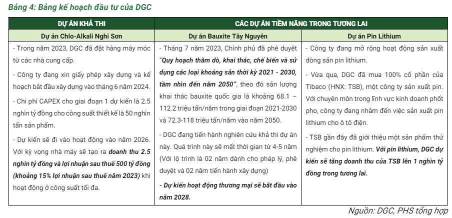 3. Nhiều dự án tiềm năng trong dài hạn như Mỏ Apatit thứ hai sẽ giúp cải thiện biên lợi nhuận gộp, dự án Nhà máy Xút chất dẻo Nghi Sơn dự kiến khởi động xây dựng trong quý 3/2024 và có thể ghi nhận doanh thu cho DGC từ 2025, và dự án bauxite Đắk Nông