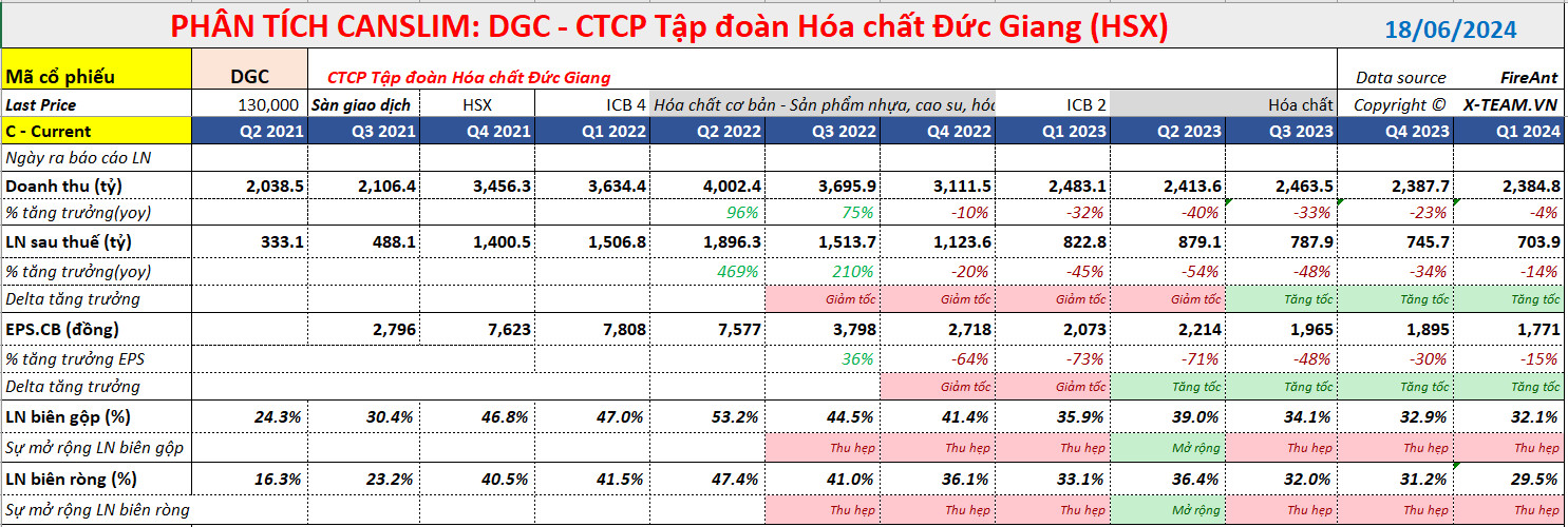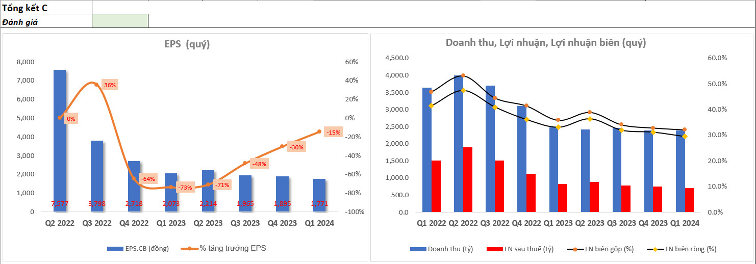 – Kết quả kinh doanh Q1/2024 với doanh thu đạt 2.385 tỷ VND (-4% YoY) và LNST ở mức 704 tỷ VND (-16% YoY) nhìn chung có sự giảm nhẹ so với cùng kỳ. Tuy nhiên theo bảng phân tích canslim thì lợi nhuận sau thuế và EPS tính từ Q3/2023 đến Q1/2024 đang có sự tăng tốc quý này so với quý trước.