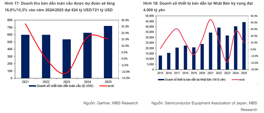 Theo Thống kê Thương mại Chất bán dẫn Thế giới (WSTS) dự báo ngành công nghiệp bán dẫn toàn cầu được dự báo sẽ tăng trưởng 11,8% lên 576 tỷ USD vào năm 2024 với sự phục hồi lớn dự kiến ở phân khúc bộ nhớ (+ 40% svck). Theo dự báo mới nhất từ Gartner, Inc., doanh thu bán dẫn toàn cầu được dự phóng sẽ tăng 16,8%/15,5% svck vào năm 2024/2025 đạt 624 tỷ USD/721 tỷ USD. Trong khi đó tại thị trường Nhật Bản – một trong những thị trường xuất khẩu lớn nhất của DGC, Hiệp hội thiết bị bán dẫn Nhật Bản (SEAJ) dự phóng doanh số các thiết bị bán dẫn sẽ tăng trưởng 27%/10% svck trong 2024/2025.