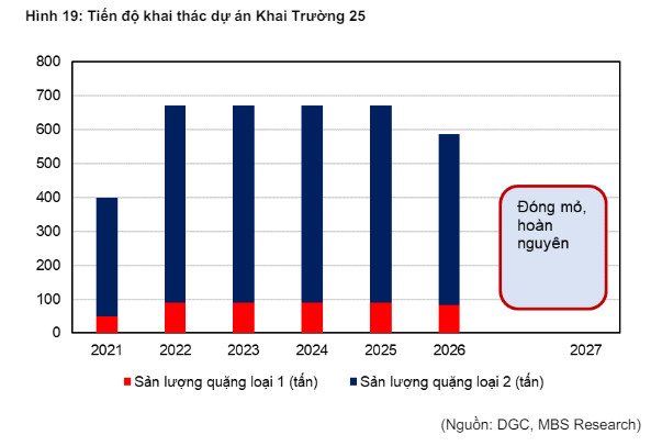 + DGC hiện đang sở hữu mỏ Khai Trường 25 tại tỉnh Lào Cai – khởi công xây dựng vào đầu năm 2021 với trữ lượng 3,7 triệu tấn và khai thác trong vòng 6 năm. Mỏ thứ hai là Khai Trường 19b tại tỉnh Lào Cai – khởi công xây dựng vào đầu năm 2023 và thuộc sở hữu của Công ty Cổ phần Hóa chất Lào Cai. DGC ký hợp đồng tiêu thụ 5 triệu tấn và khai thác trong vòng 5 năm. DGC đã bắt đầu mua quặng từ cuối quý 2 năm 2023. Như vậy,