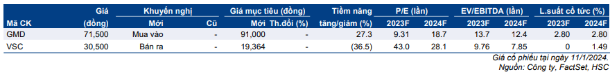 GMD: HSC duy trì khuyến nghị Mua vào đối với GMD, lựa chọn hàng đầu của chúng tôi, đồng thời giữ nguyên giá mục tiêu là 91.000đ, tương đương tiềm năng tăng giá 27%. Sau khi giá cổ phiếu tăng 8% trong 3 tháng qua, GMD đang giao dịch với P/E trượt dự phóng 1 năm là 20 lần, cao hơn một chút so với bình quân 4 năm ở mức 17,3 lần nhưng chúng tôi tin rằng GMD xứng đáng được định giá lại ở mặt bằng cao hơn nhờ triển vọng lợi nhuận tăng trưởng mạnh mẽ & bền vững.