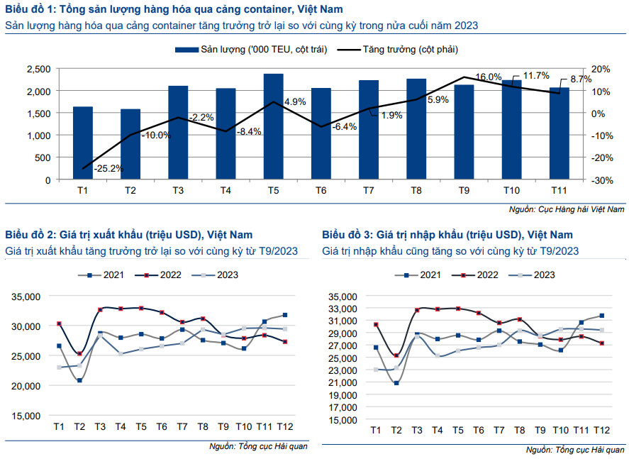 Sản lượng hàng hóa qua cảng cải thiện mạnh nhờ mức nền thấp cùng kỳ năm ngoái. Các thị trường trọng điểm, bao gồm Mỹ & EU, đã cắt giảm mạnh đơn đặt hàng kể từ nửa cuối năm 2022 để giảm lượng hàng toàn kho về mức bình thường. Sau giai đoạn giải phòng hàng tồn kho, các đơn đặt hàng đã hồi phục trở lại và hoạt động thương mại đã dần cải thiện. Theo Tổng cục Thống kê, giá trị thương mại Q4/2023 của Việt Nam đã tăng 6,4% so với cùng kỳ và tăng 2,8% so với quý trước.