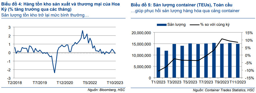 HSC cũng nhận thấy xu hướng hồi phục của sản lượng container trên thế giới. Theo Container Trades Statistics, sản lượng container toàn cầu đã tăng trưởng dương trở lại kể từ tháng 8/2023 sau khi sụt giảm trong 12 tháng kể từ tháng 8/2022.