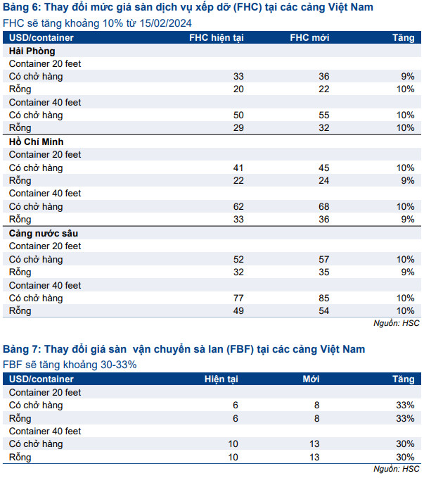 HSC đánh giá tình hình ở Biển Đỏ sẽ chỉ là rủi ro ngắn hạn. Do đó, chúng tôi tin rằng sản lượng hàng hóa qua cảng có thể sẽ phục hồi mạnh mẽ trong năm 2024, đặc biệt là nửa đầu năm 2024 từ mức nền thấp cùng kỳ năm ngoái, là khoảng thời gian các doanh nghiệp giải phóng hàng tồn kho. Ngoài ra, triển vọng của các công ty cảng biển được kỳ vọng cũng sẽ rất tích cực trong năm 2024 nhờ giá dịch vụ xếp dỡ tăng lên dựa trên Thông tư 39/2023/TT-BGTVT tăng khoảng 10% giá sàn dịch vụ xếp dỡ container (FHC) và 30-33% giá sàn vận chuyển sà lan (FHF) bên cạnh các nội dung khác.