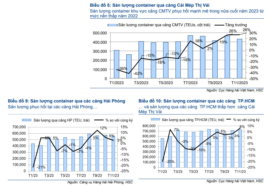 Trong số các trung tâm container chính của Việt Nam, HSC tin rằng lợi nhuận của các cảng ở khu vực CMTV sẽ tăng trưởng mạnh nhất trong năm 2024, so với các cảng ở khu vực Hải Phòng & HCM. Điều này là do các cảng ở tại CMTV đã chịu tác động tiêu cực do đơn hàng từ Mỹ & EU sụt giảm với khoảng 90% hàng hóa ở khu vực này xuất khẩu sang các thị trường Mỹ & EU. Trong khi đó, thị trường xuất khẩu của các trung tâm container khác có sự đa dạng hơn đáng kể. Theo đó, nhu cầu từ Mỹ & EU tăng lên với lượng tồn kho trở lại mặt bằng bình thường, các cảng ở khu vực CMTV sẽ được hưởng lợi nhiều nhất. Trên thực tế, sản lượng hàng hóa qua các cảng ở khu vực này kể từ tháng 7-11/2023 tăng 20% so với cùng kỳ, so với giảm 17,5% so với cùng kỳ trong 6 tháng đầu năm 2023.