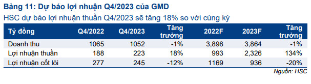 GMD: Cảng biển lớn nhất của GMD là Gemalink (GIL) nằm ở khu vực CMTV. Sản lượng hàng hóa qua cảng GIL trong Q4/2023 đạt khoảng 360.000 TEU, tăng mạnh 78% so với cùng kỳ nhờ số tuyến dịch vụ mới hàng tuần trong Q4/2023 và sản lượng hàng hóa qua các cảng ở khu vực CMTV phục hồi mạnh mẽ. Từ đó, HSC ước tính lợi nhuận thuần Q4/2023 của GMD sẽ tăng 18% so với cùng kỳ đạt 223 tỷ đồng (nhưng vẫn giảm 12% so với quý trước do nhiều chi phí hoạt động thường được ghi nhận vào Q4 hàng năm).