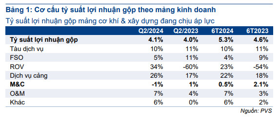 Tỷ suất lợi nhuận gộp tăng lên 5,3% trong nửa đầu năm 2024 từ mức 4,6% trong nửa đầu năm 2023 nhờ vào sự cải thiện ở các mảng kinh doanh. Tỷ suất lợi nhuận gộp mảng cơ khí & xây dựng giảm xuống 0,5%, so với mức 2,1% trong nửa đầu năm 2023. Nguyên nhân chính dẫn đến tỷ suất lợi nhuận gộp mảng này thấp là do vốn đầu tư ban đầu và chi phí thực hiện chuyển đổi sang mảng năng lượng tái tạo từ mảng dầu khí truyền thống. Tổng vốn đầu tư tăng có thể đến từ việc PVS đầu tư xây dựng các xưởng sơn chân đế tuabin điện gió hoặc mở rộng cảng để chứa thêm hàng tồn kho trong mảng dầu khí và năng lượng tái tạo. Thông thường, giai đoạn nửa đầu năm là mùa thấp điểm của doanh thu và lợi nhuận. Lợi nhuận thuần sau cổ đông thiểu số trong nửa đầu năm 2024 đóng góp 42% lợi nhuận cho cả năm. Chi phí quản lý trong nửa đầu năm 2024 cũng cao hơn so với cùng kỳ do không có khoản hoàn nhập dự phòng cho các khoản nợ khó đòi.