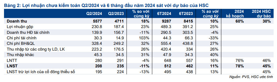 PVS công bố LNST Q2/2024 vừa phải ở mức 208 tỷ đồng (giảm 11% so với cùng kỳ), sát với dự báo của chúng tôi. Tính chung 6 tháng đầu năm 2024, Công ty ghi nhận 512 tỷ đồng LNST (tăng 11% so với cùng kỳ), hoàn thành 78% mục tiêu năm 2024 BLĐ đề ra và đạt 45% dự báo cho cả năm của chúng tôi. Mặt khác, doanh thu nửa đầu năm 2024 được ghi nhận ở mức 9,3 nghìn tỷ đồng và chỉ đạt 30% dự báo cho cả năm của HSC.