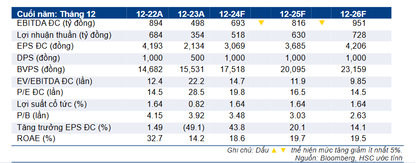 - HSC tăng lần lượt 1-3% dự báo LN thuần năm 2024-2025 nhờ cơ cấu doanh thu hiệu quả hơn, tương đương tăng trưởng lần lượt 46,1% và 23%. Chúng tôi cũng đã đưa ra dự báo lần đầu cho năm 2026 với LN thuần tăng trưởng 15,6%. Theo đó, LN thuần sẽ tăng trưởng với tốc độ CAGR 3 năm ở mức 27,1%.