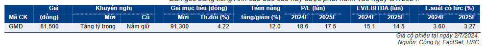 HSC nâng khuyến nghị đối với GMD lên Tăng tỷ trọng (từ Nắm giữ) với giá mục tiêu mới là 91.300đ (tiềm năng tăng giá 12%) sau khi tăng bình quân 7% dự báo LNTT từ HĐKD cốt lõi năm 2024-2026 sau khi đưa vào mô hình dự báo những tác động tích cực từ tình trạng tắc nghẽn cảng đối với GIL và triển vọng tốt hơn cho cảng NĐV sau khi nạo vét luồng Kênh Hà Nam. GMD đang giao dịch với P/E trượt dự phóng 1 năm là 19,8 lần, cao hơn 0,6 độ lệch chuẩn so với bình quân 3 năm ở mức 18,5 lần. HSC cho rằng GMD xứng đáng được định giá lại với mặt bằng cao hơn trên cơ sở triển vọng lợi nhuận mạnh mẽ.