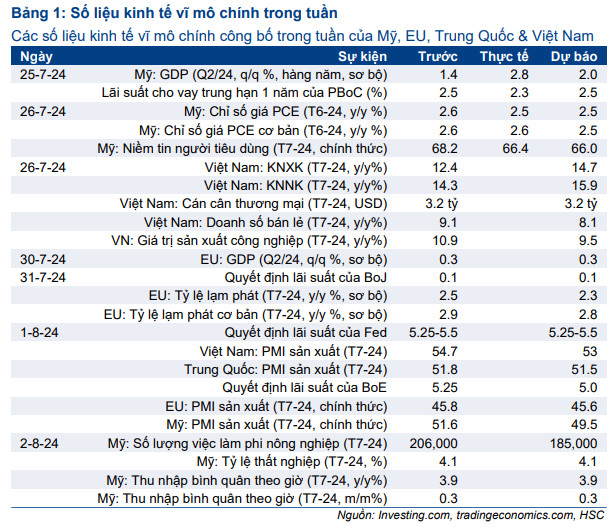 Trong tuần cuối tháng 7, thị trường sẽ chú ý tới cuộc họp của Fed với kỳ vọng lãi suất điều hành sẽ được giữ nguyên. Tuy nhiên, thị trường hiện dự đoán chắc chắn lãi suất điều hành sẽ giảm 25 điểm cơ bản vào tháng 9. Cũng về chính sách tiền tệ, Ngân hàng trung ương Anh (BOE) nhiều khả năng sẽ giảm 25 điểm cơ bản lãi suất điều hành lần đầu tiên sau 4 năm sau khi lạm phát giảm xuống dưới mức mục tiêu của BOE là 2%. Trong khi đó, Ngân hàng trung ương Nhật Bản (BOJ) có thể tăng 25 điểm cơ bản lãi suất điều hành. Ngoài ra, nền kinh tế Mỹ dự kiến có thêm 186.000 việc làm mới trong tháng 7, thấp hơn số lượng việc làm mới trong tháng 6 ở mức 206.000 việc làm. Tỷ lệ thất nghiệp có thể tương đương mức đỉnh trong năm 2021 là 4,1%, với tăng trưởng tiền lương đạt 0,3% so với tháng trước.